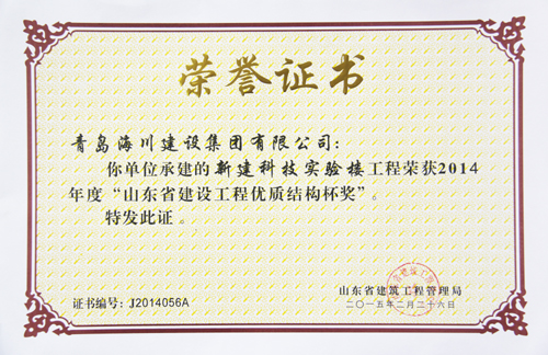 最近,七分公司青島農(nóng)業(yè)大學(xué)新建科技實(shí)驗(yàn)樓工程先后從山東省建筑工程管理局捧回了分別于2015年一月和二月頒發(fā)的兩項(xiàng)省級(jí)榮譽(yù)證書——榮獲“2014年度山東省建筑施工安全文明標(biāo)準(zhǔn)化優(yōu)良工地”和榮獲“2014年度山東省優(yōu)質(zhì)結(jié)構(gòu)杯獎(jiǎng)”。消息傳到工地,大家歡欣鼓舞,一年多的努力終于結(jié)出了豐碩的成果。